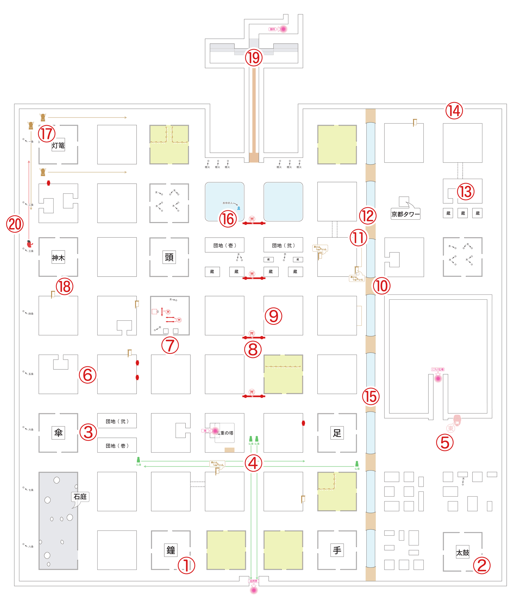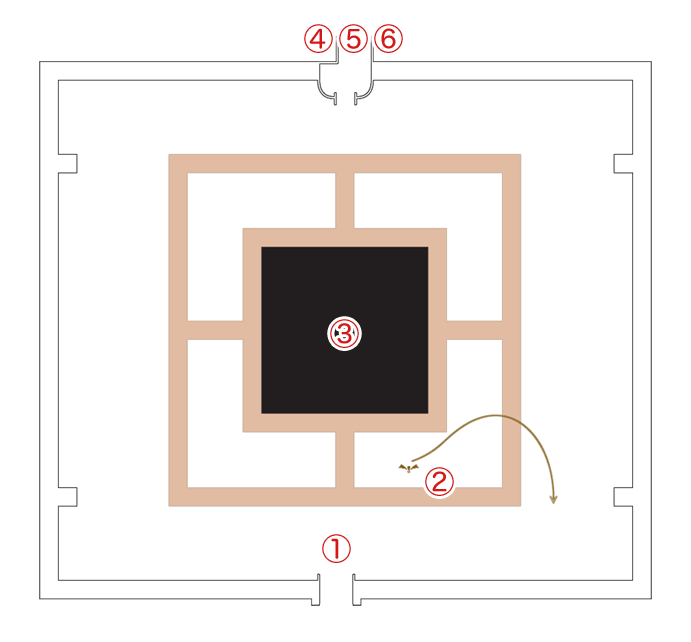 マップの上からは御所へ。マップ右の石造りの建物からはミニチュア広場へ。